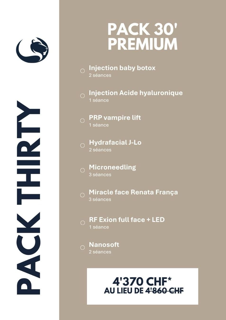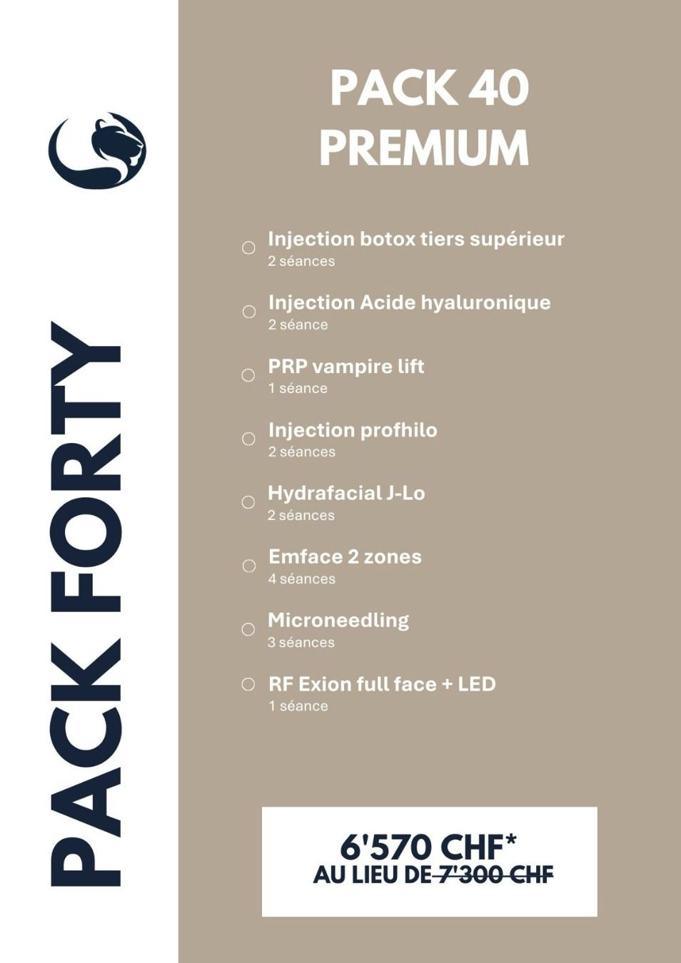 Forfait Premium : Un protocole plus avancé intégrant des actifs anti-âge puissants pour booster l’éclat, lisser les ridules et améliorer la tonicité de la peau. Ce forfait est conçu pour offrir une prise en charge globale et visible dès les premières séances.